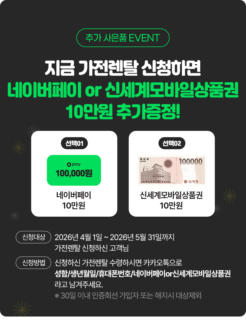 • 신청방법 : 휴대폰 개통되면 카카오톡으로 "성함/번호/생년월일/선택하신 가전구독 상품" 을 남겨주세요!